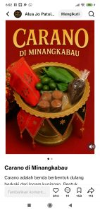 AKTAMEDIA.COM, PADANG – Carano Minang adalah wadah logam berkaki khas Minangkabau berbentuk dulang yang berisi perlengkapan sirih (sirih, pinang, gambir, kapur) dan tembakau, digunakan sebagai simbol penghormatan, penerimaan tamu, dan bagian penting dalam upacara adat seperti meminang, pernikahan, hingga musyawarah, melambangkan keharmonisan dan harapan dalam budaya Minang.